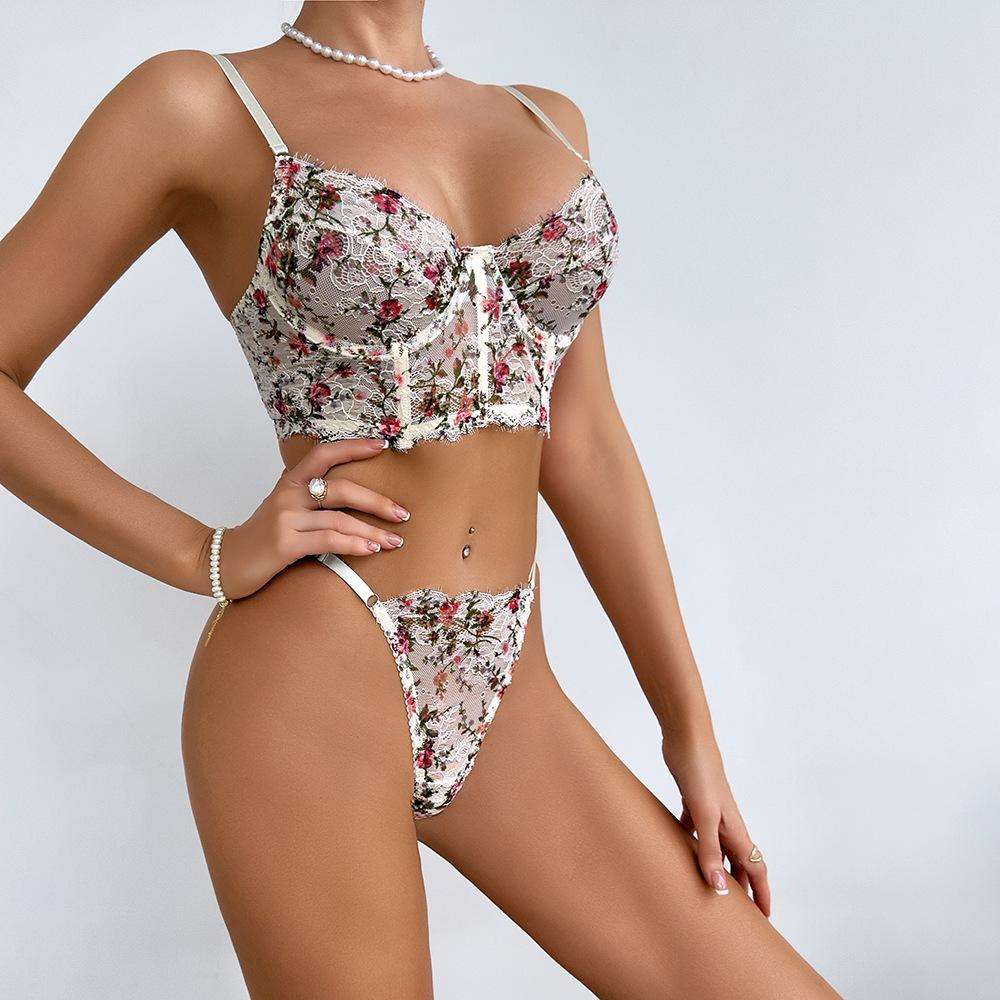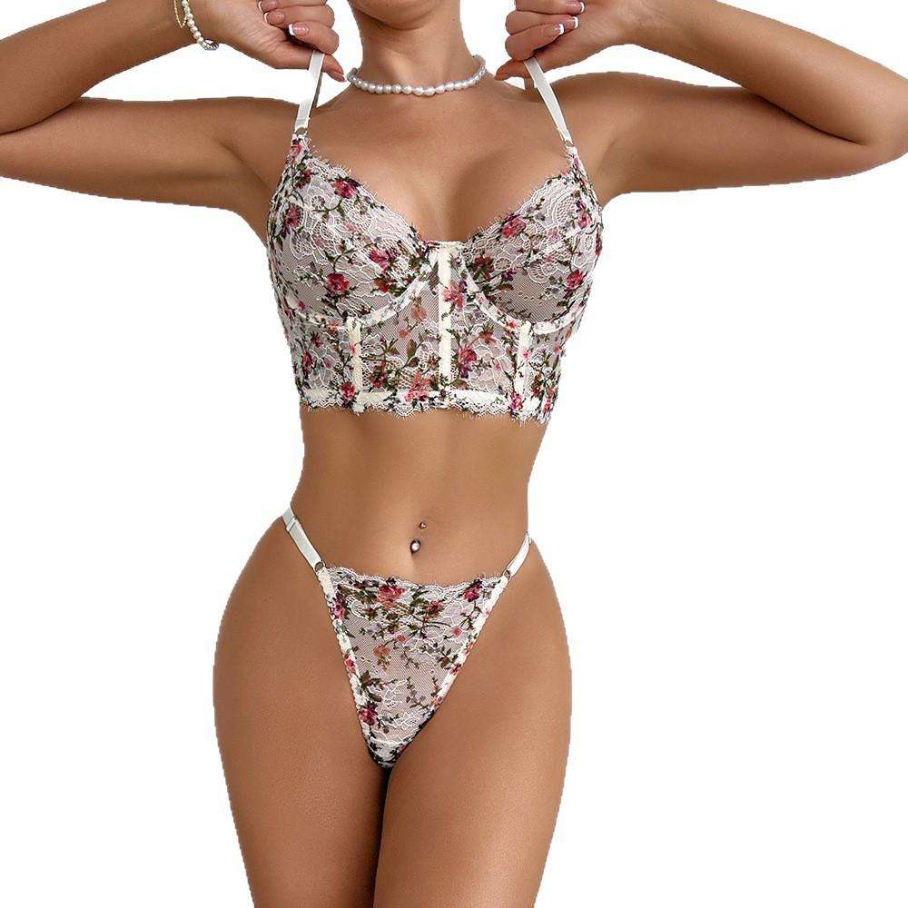 2025 New Sexy Mesh Embroidery and Hollowed-out Flower See-through Seductive and Sensual Lingerie Set