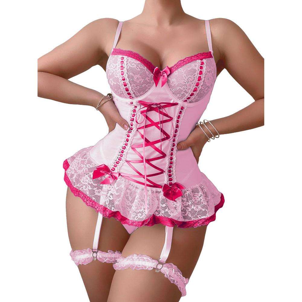 A Best-selling Pure and Sensual Girlish Style Sexy See-through Lace Bow Leg Circumference One-piece Romantic Lingerie Set