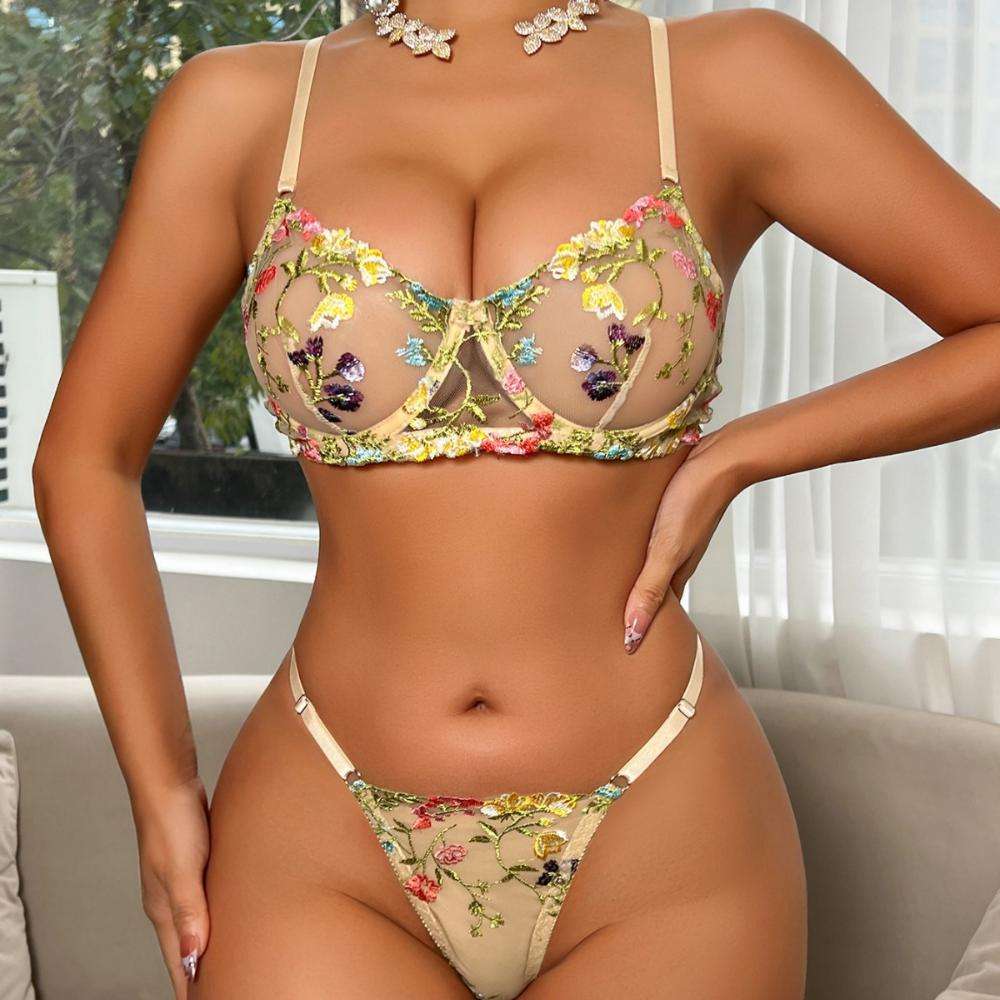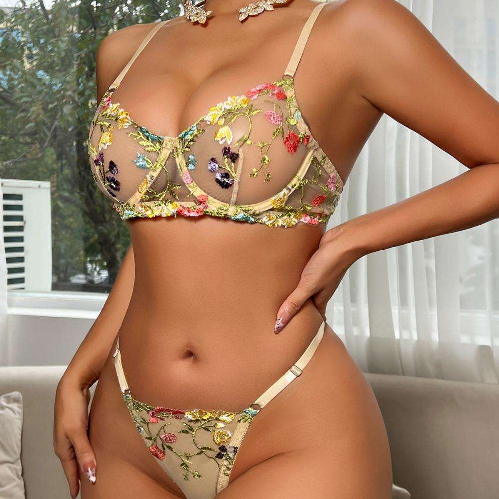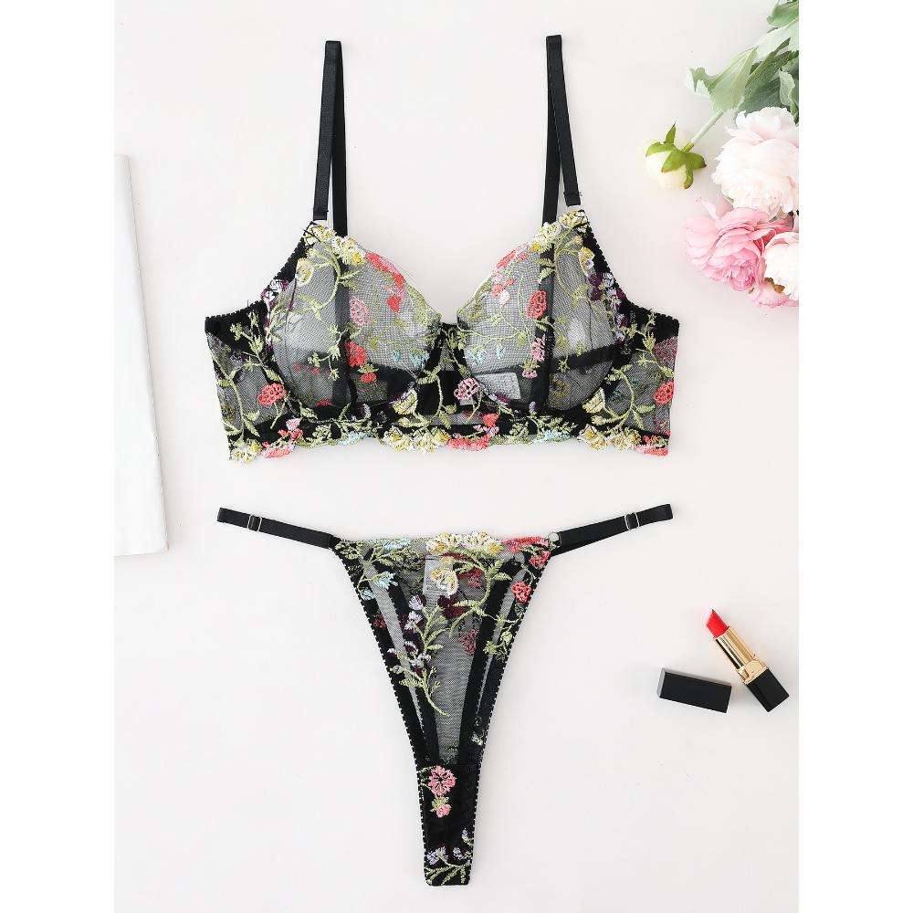 A Best-selling Sexy Single-layer Floral Print with See-through Lace Mesh and Steel Ribbed Thong Lingerie Set