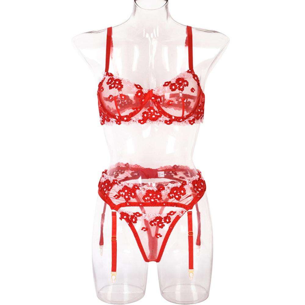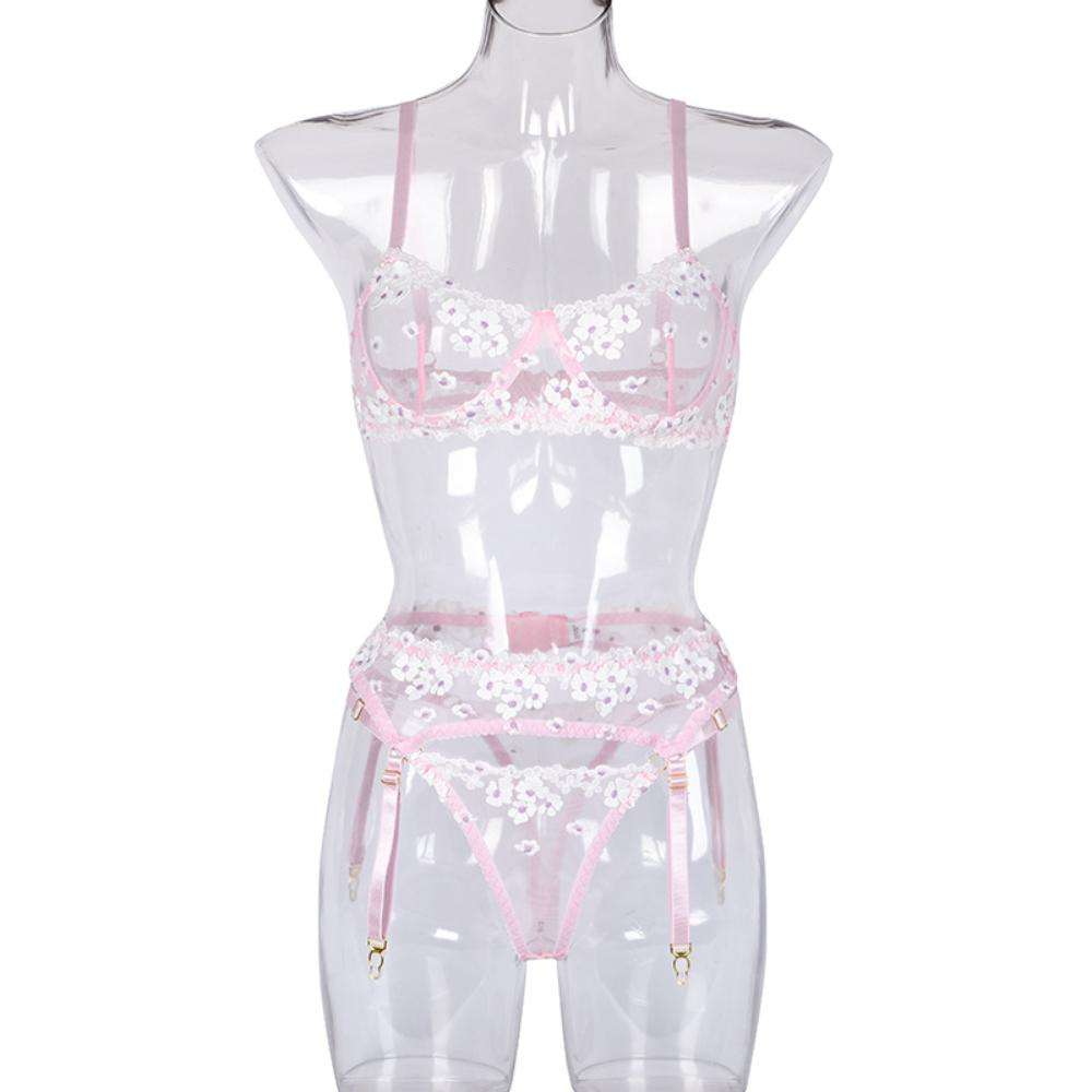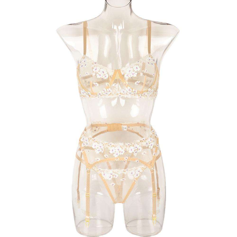 A New Mini Flower-patterned and Embroidered Three-piece Set of Popular European and American Lingerie for Women