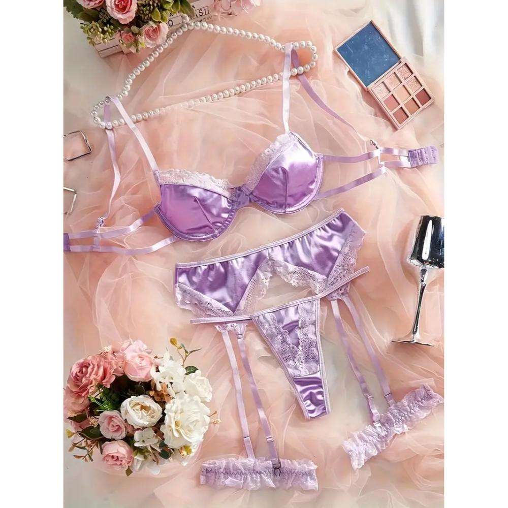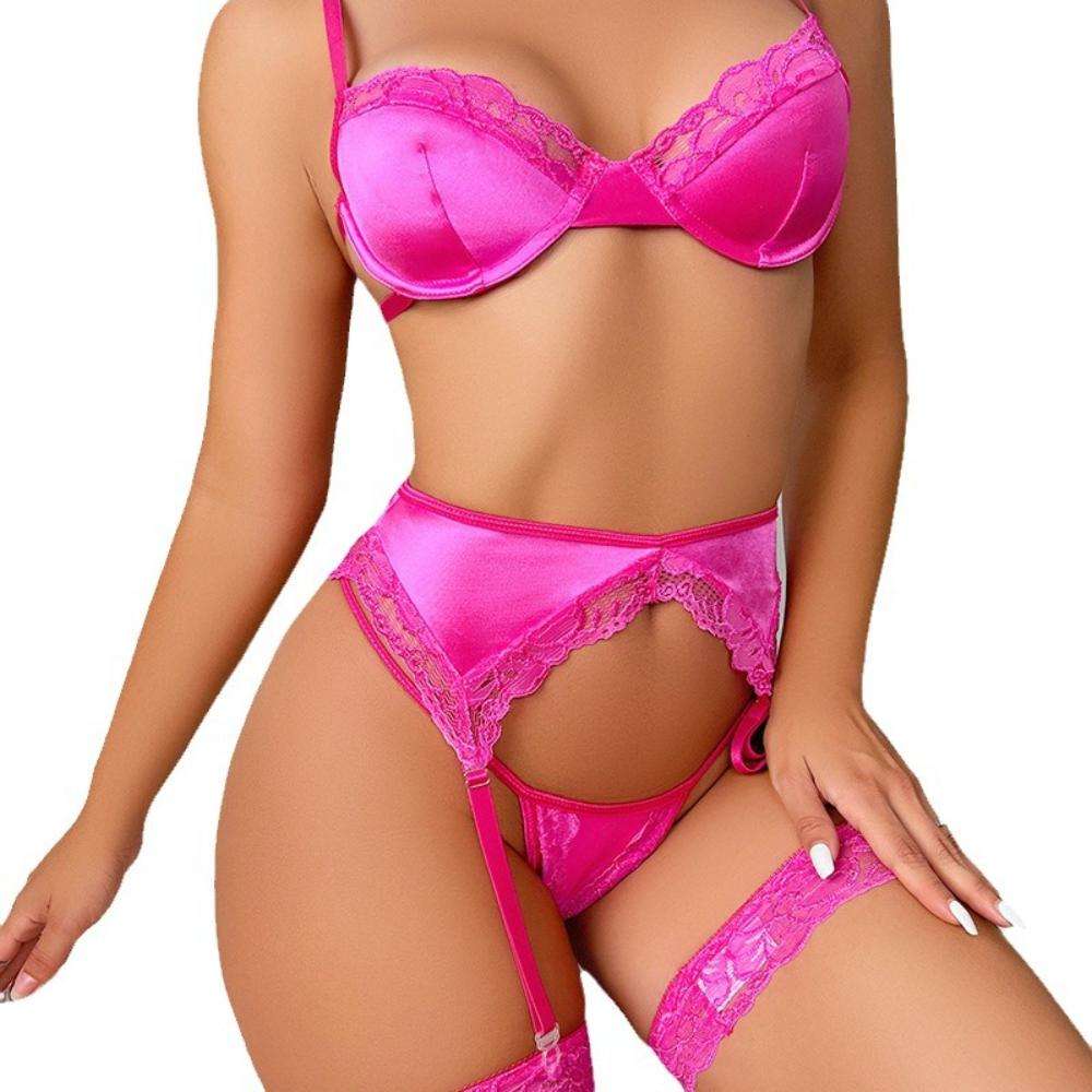 A New Set of Four-piece Sexy Lingerie Featuring Three-point Lace Cutout V-neck Halter Straps with Leg Loops