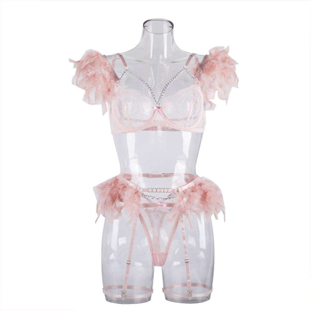 A New Sexy and Trendy Feather Lace Chain Four-piece Set Lace Patchwork Chain Sexy Transparent Mesh Fabric Underwear