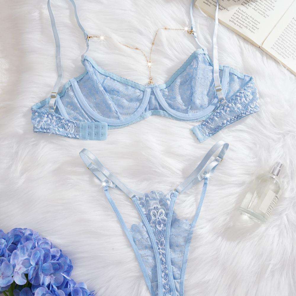 A New Style of Blue Mesh Lace Ribbon Lace See-through Sexy and Romantic Underwear with European and American Style