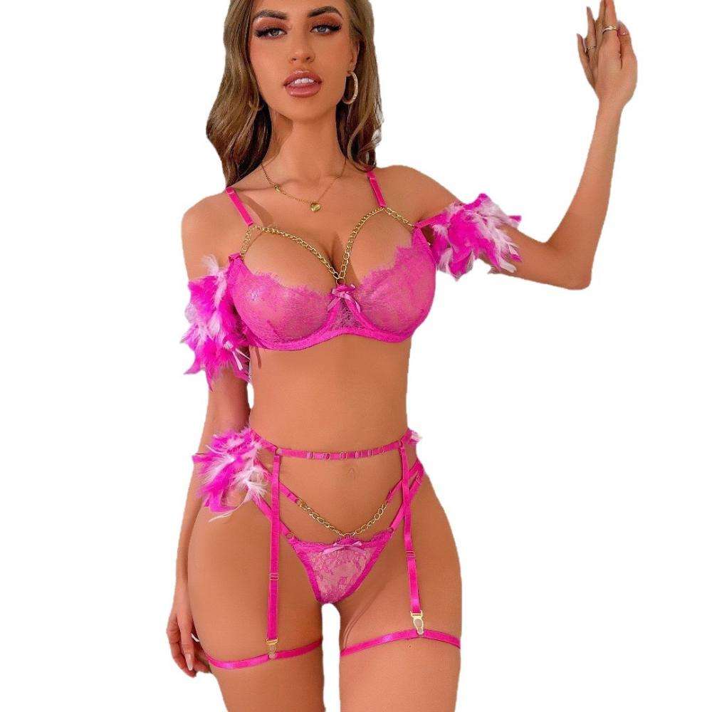 A Popular European and American Erotic Lingerie Set Featuring Feather Lace Patchwork Ankle Straps for a Sexy and Slimming Look