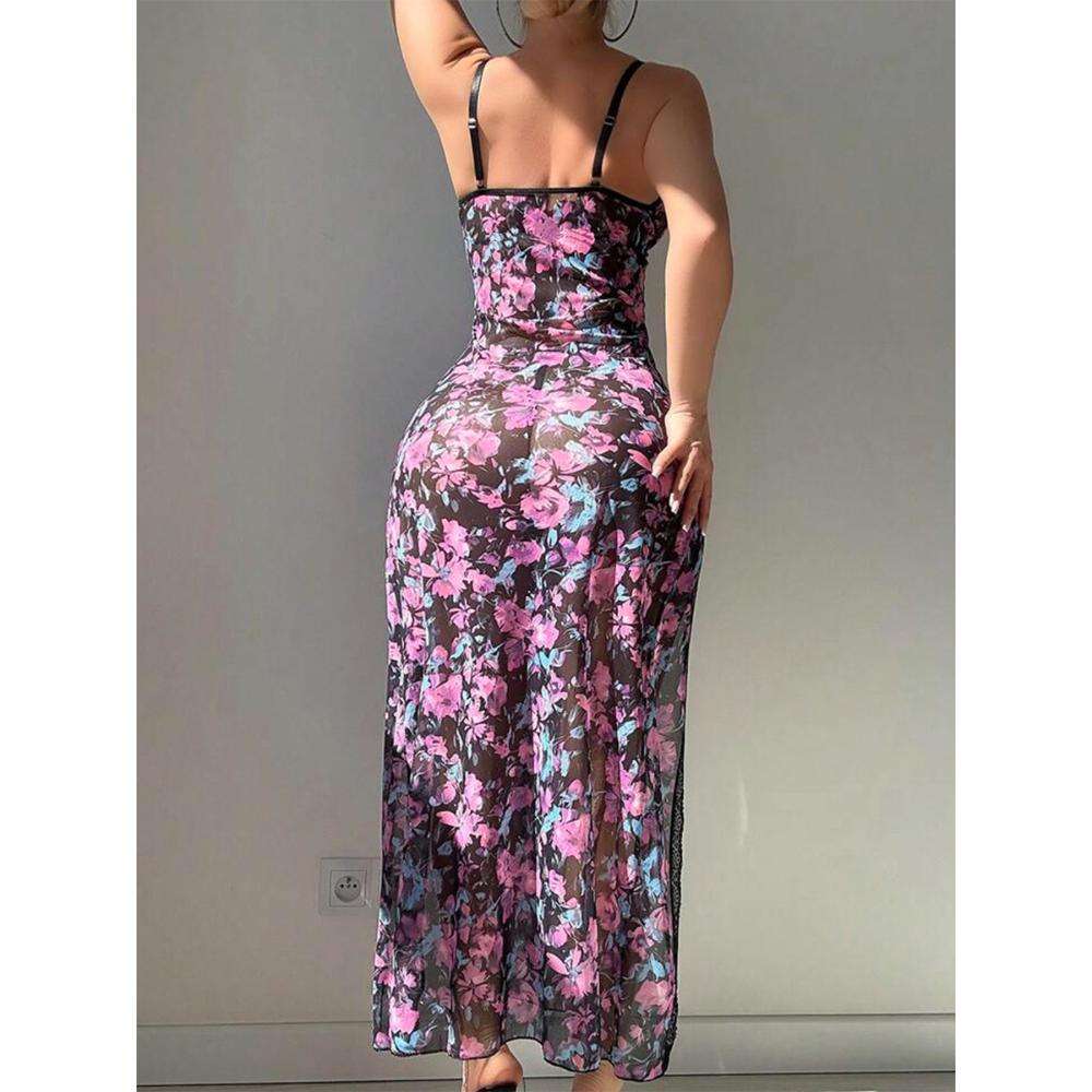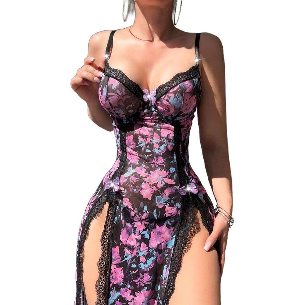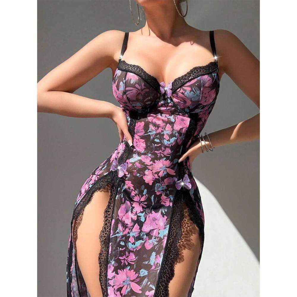 A Popular European and American Women’s Seducting Floral Mesh Lace Double Slit Sexy See-through Pajama Dress Set