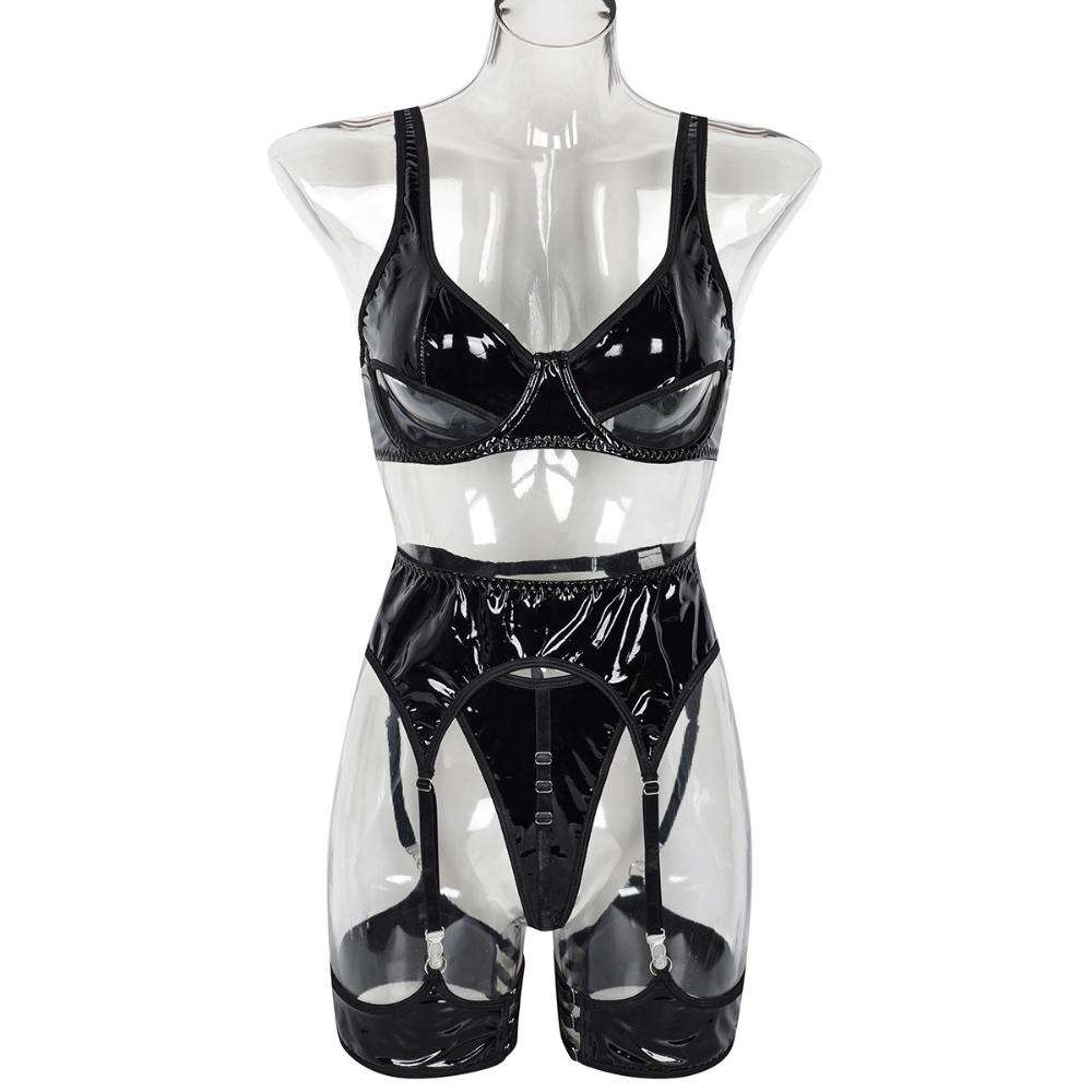 Affordable Sexy Satin Smooth Spaghetti Strap Lingerie Set Leather Bra Leather Panty Set