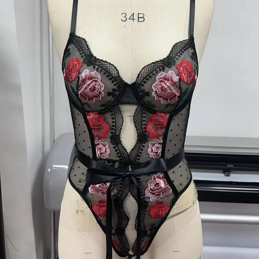 Black Red Jumpsuit with Floral Embroidery Lace Trim Color Block Strap Design Sexy Style Logo Positioned at Waist