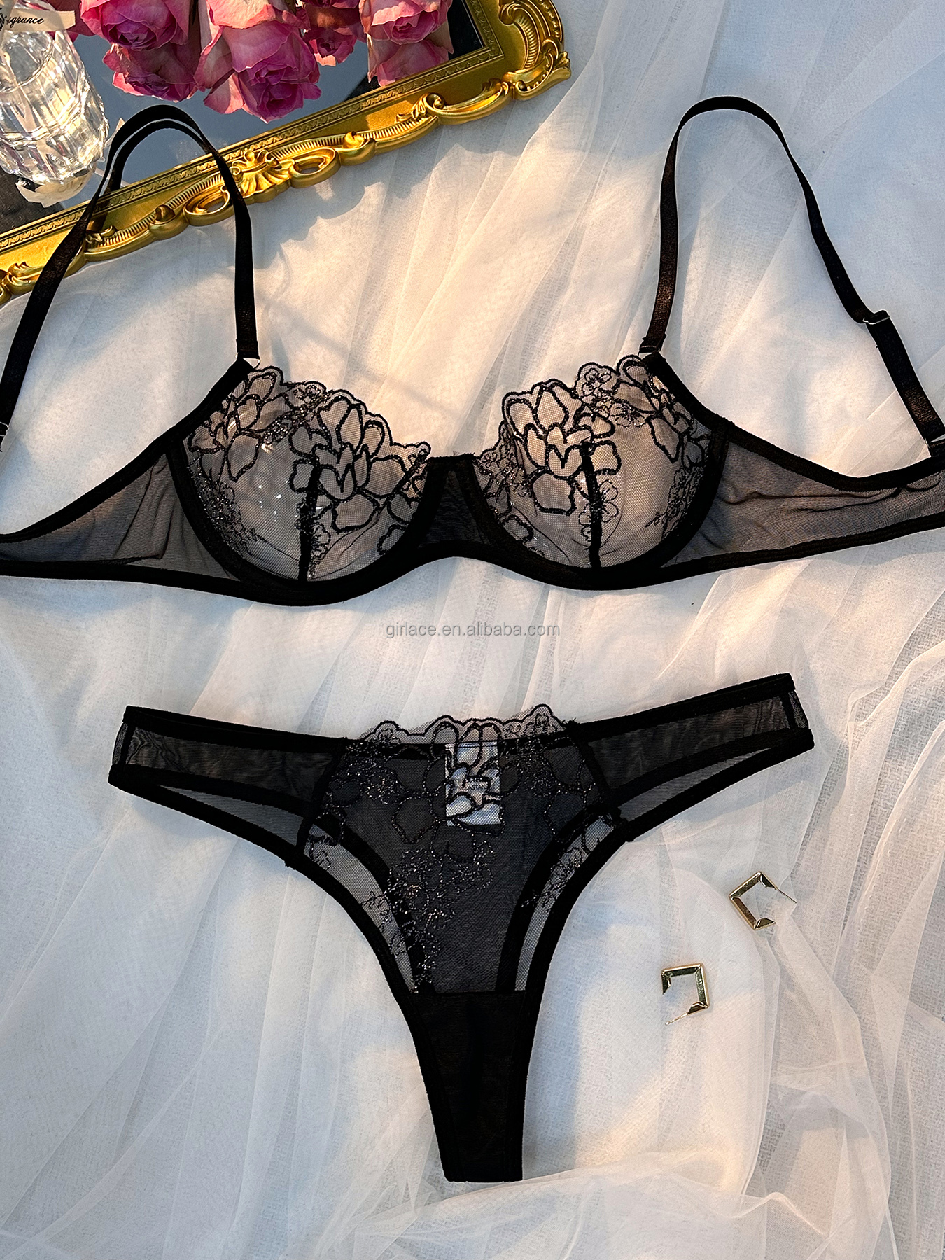 Black Transparent Women Underwire Push up Bra Thong Cute 3 Piece Lace Lingerie Set