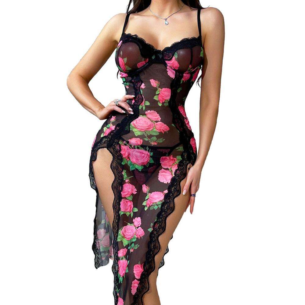 European and American Best-selling Women’s Underwear: Sexy Mesh Printed Lace Double Slit Halter Dress, Romantic Dress Pajama Set