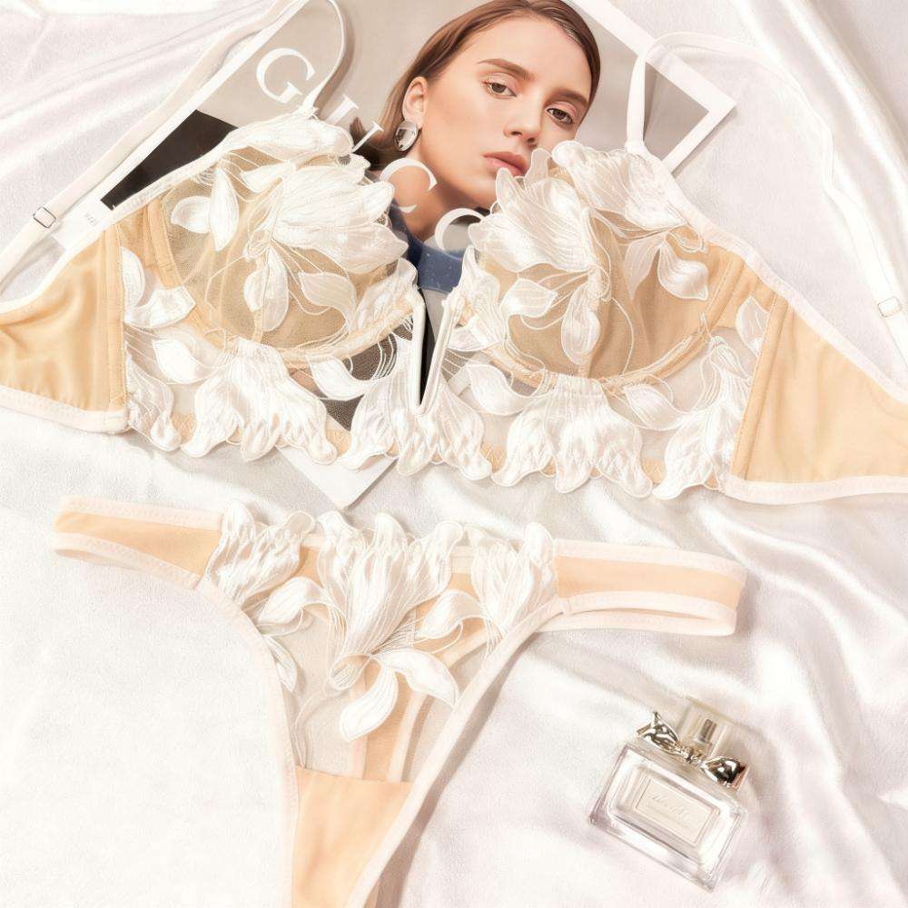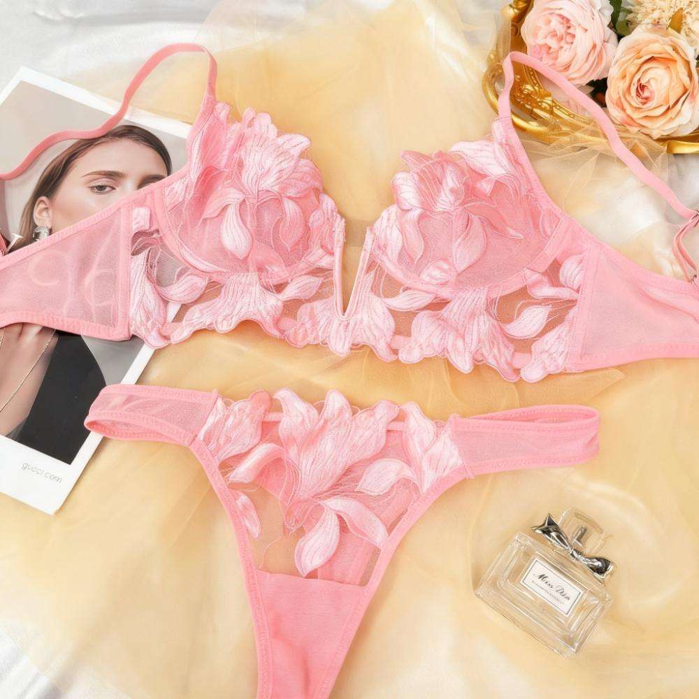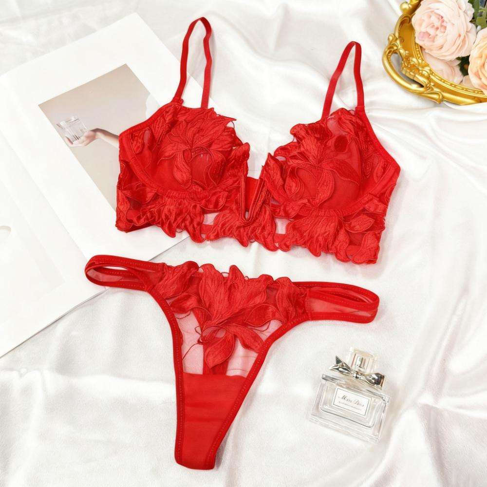 European and American Erotic Lingerie with a Deep Feminine Touch, V-embroidered Ultra-thin Lace Bra, Sexy Lingerie Set