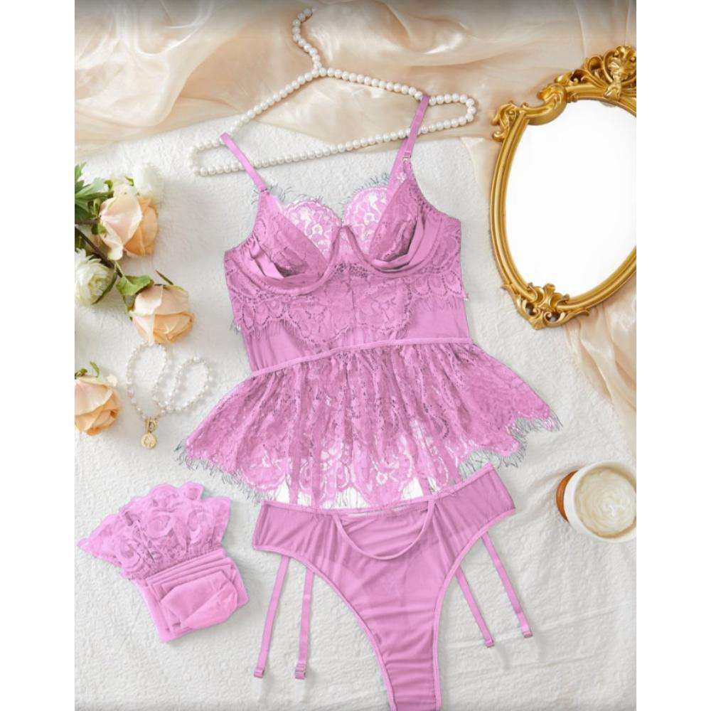 European and American Sex Lingerie Three-point 2025 Lace Sexy Women’s Set Three-piece Set with Steel Rims and Garter Straps