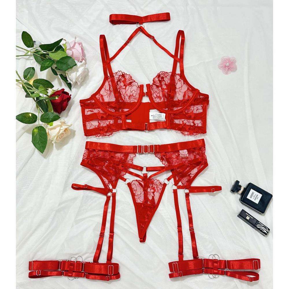 European and American Sexy Neck-hanging, Embroidered, See-through Mesh Fabric Patchwork Lingerie and Underpants Set