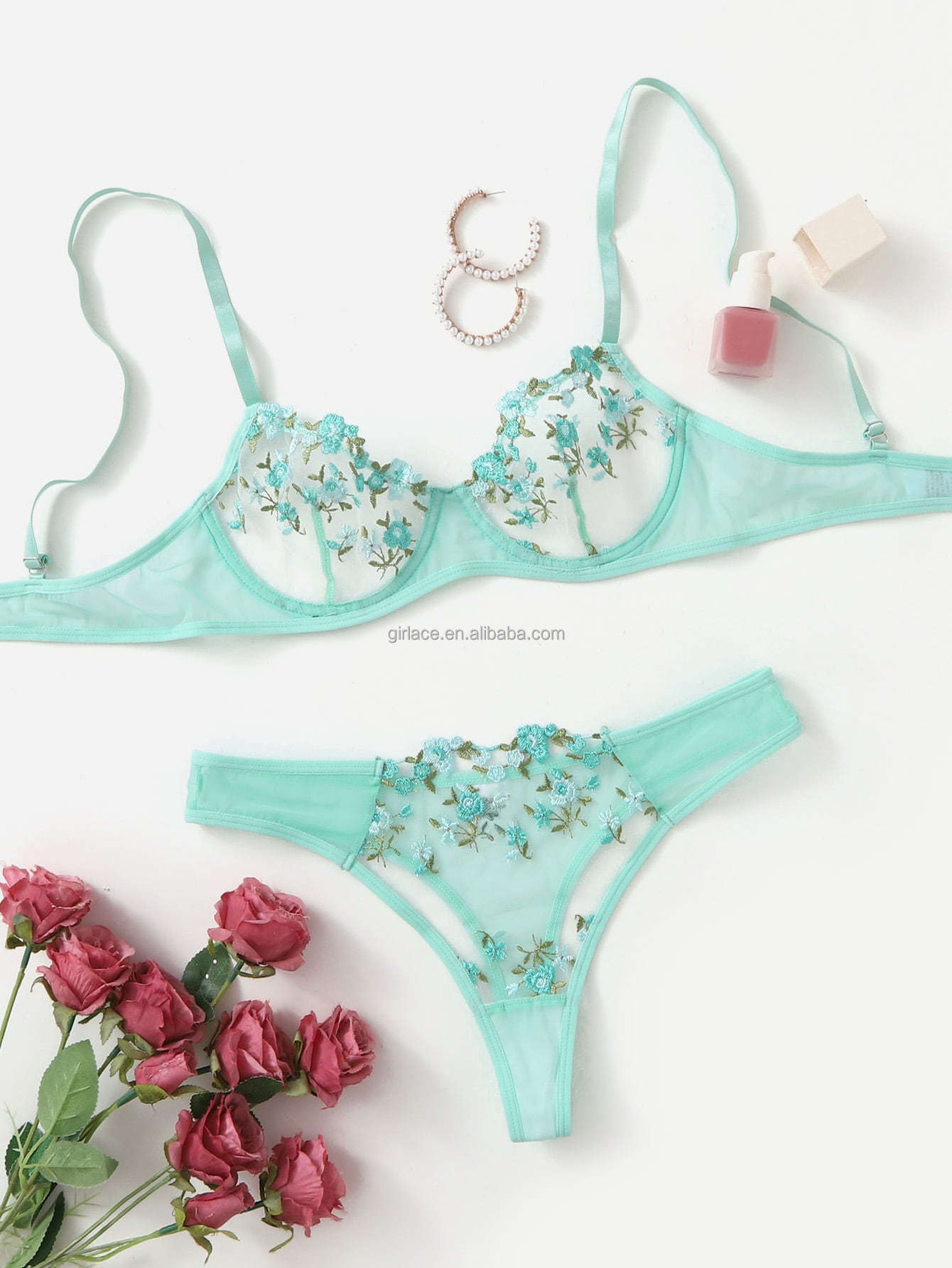 Female Embroidered Mesh Underwire Lenceria Blue Sexy Underwear Bra & Brief Conjuntos Lingerie Bralete Sets