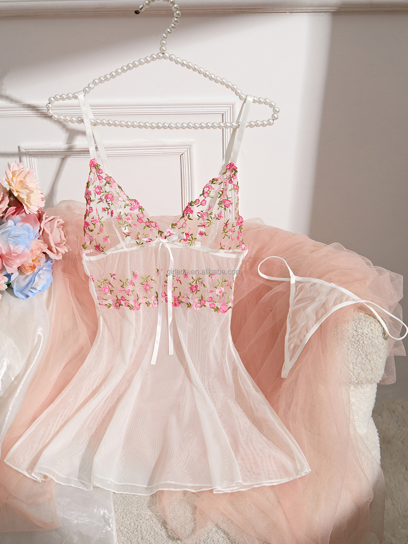 Floral See Through Sexy Slip Dress Mesh Cute Girls Sexy Nightwear Sleep Nightdress Lingerie Dress Set