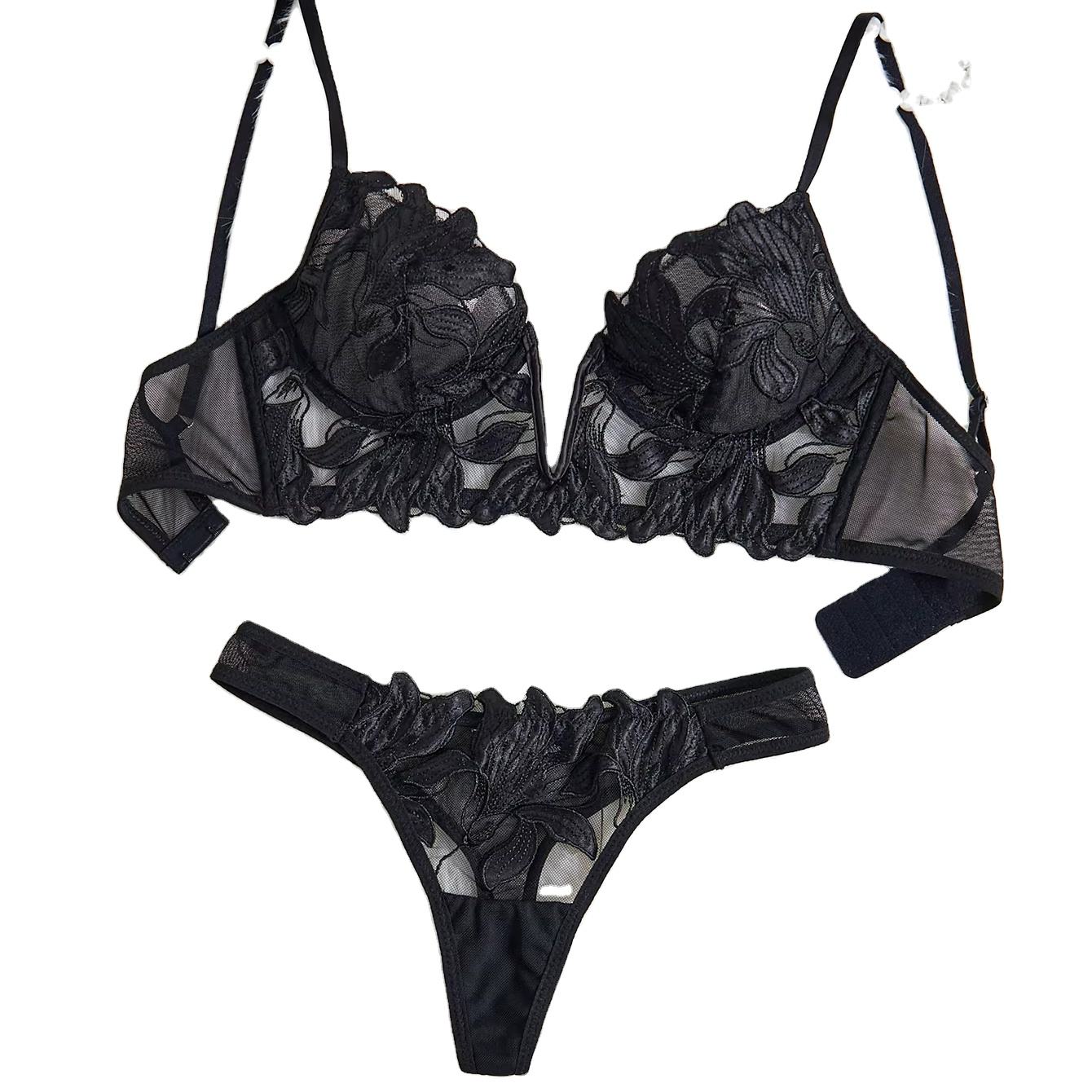 French Style Sexy UltraThin Women Floral Lingerie Set V Shape Bra Underwire Push up Bra and Panty Set