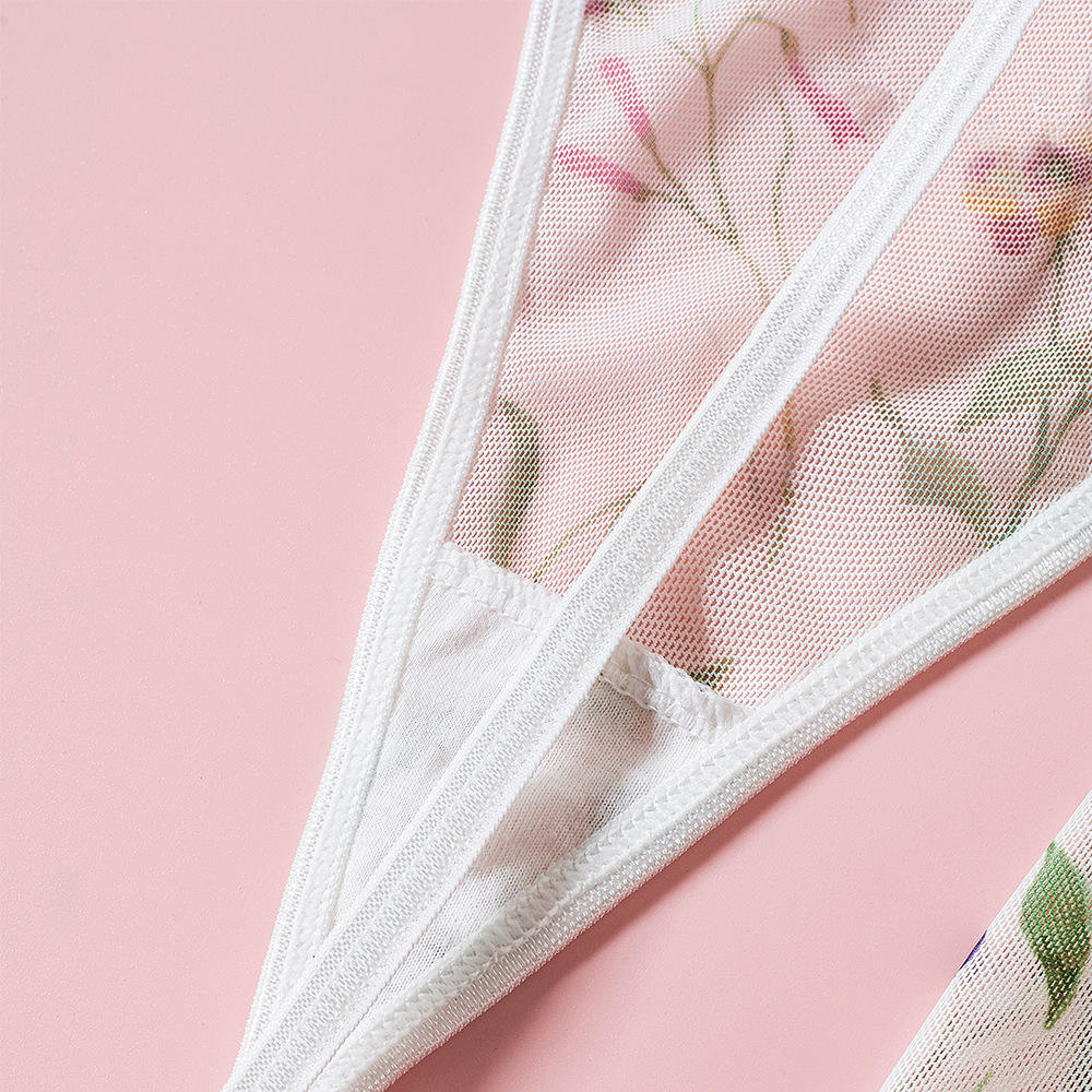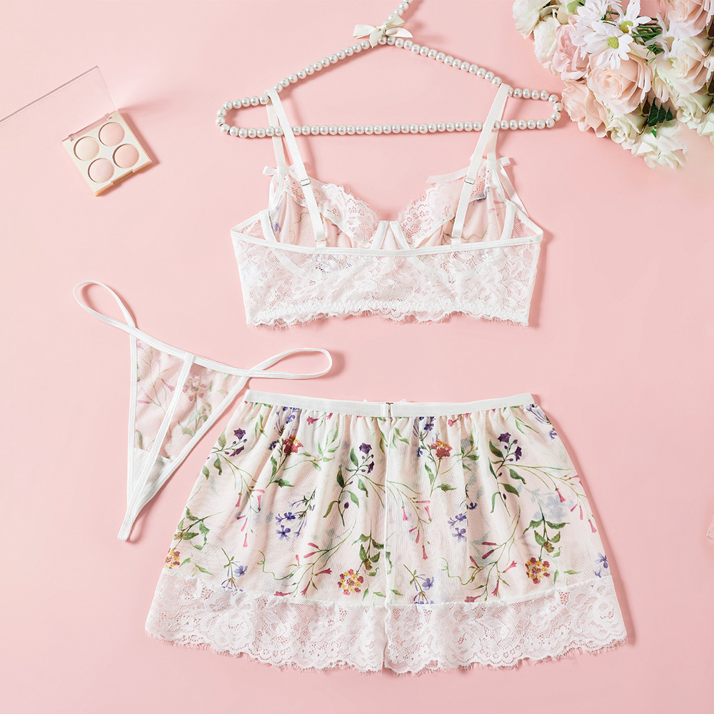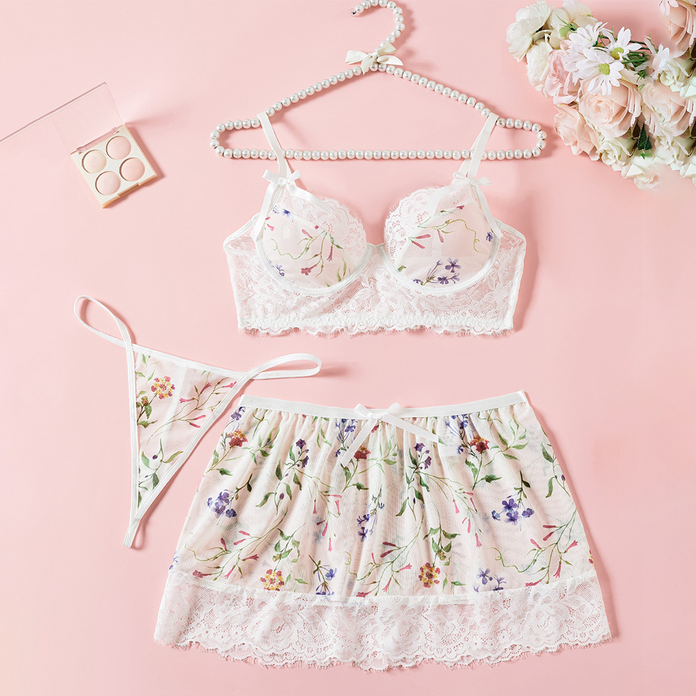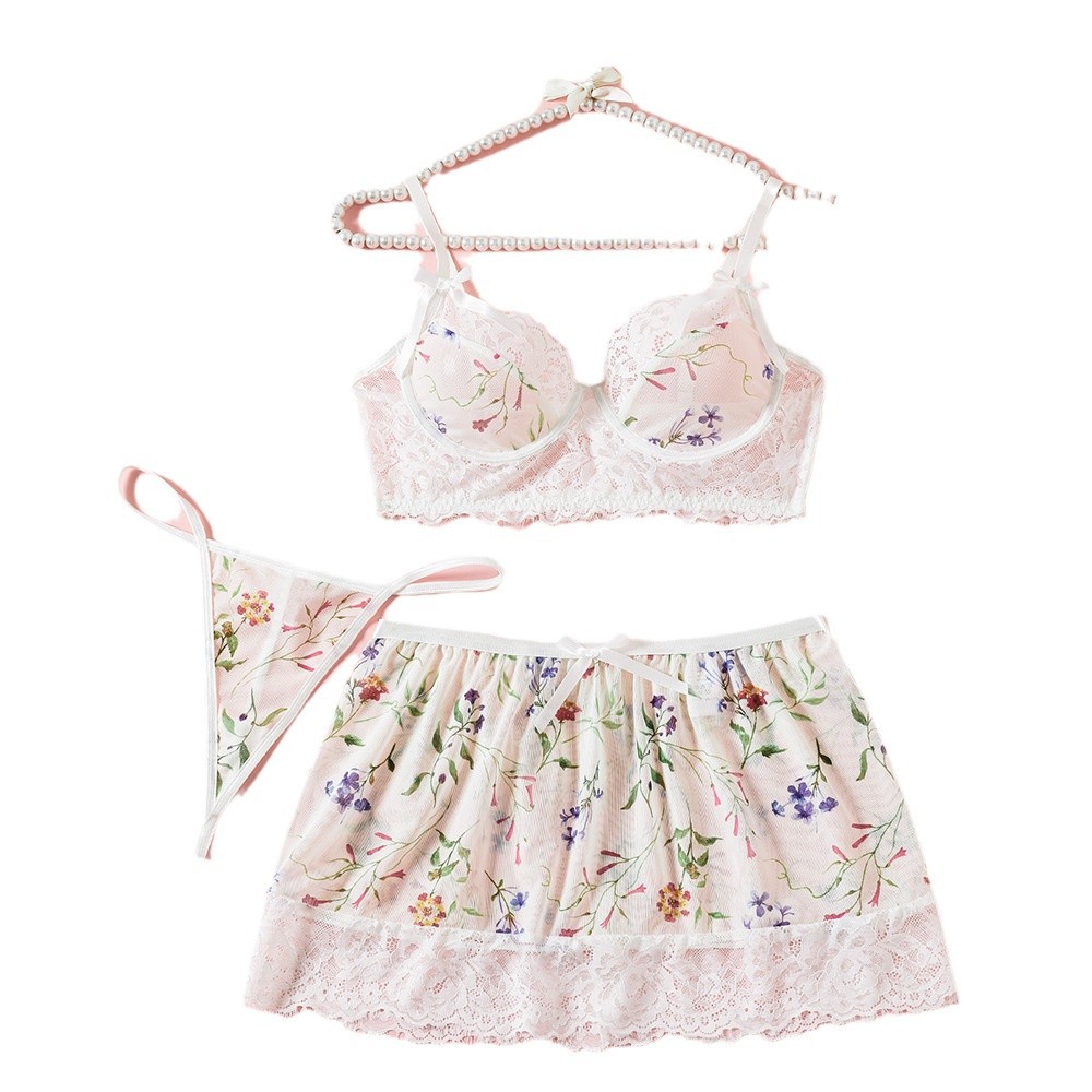 Hot-Selling Sexy Three-Piece Lingerie Set Floral Contrast Bra Low-Rise Short Skirt Thong Lace Trim Push-Up Playful Cute Style