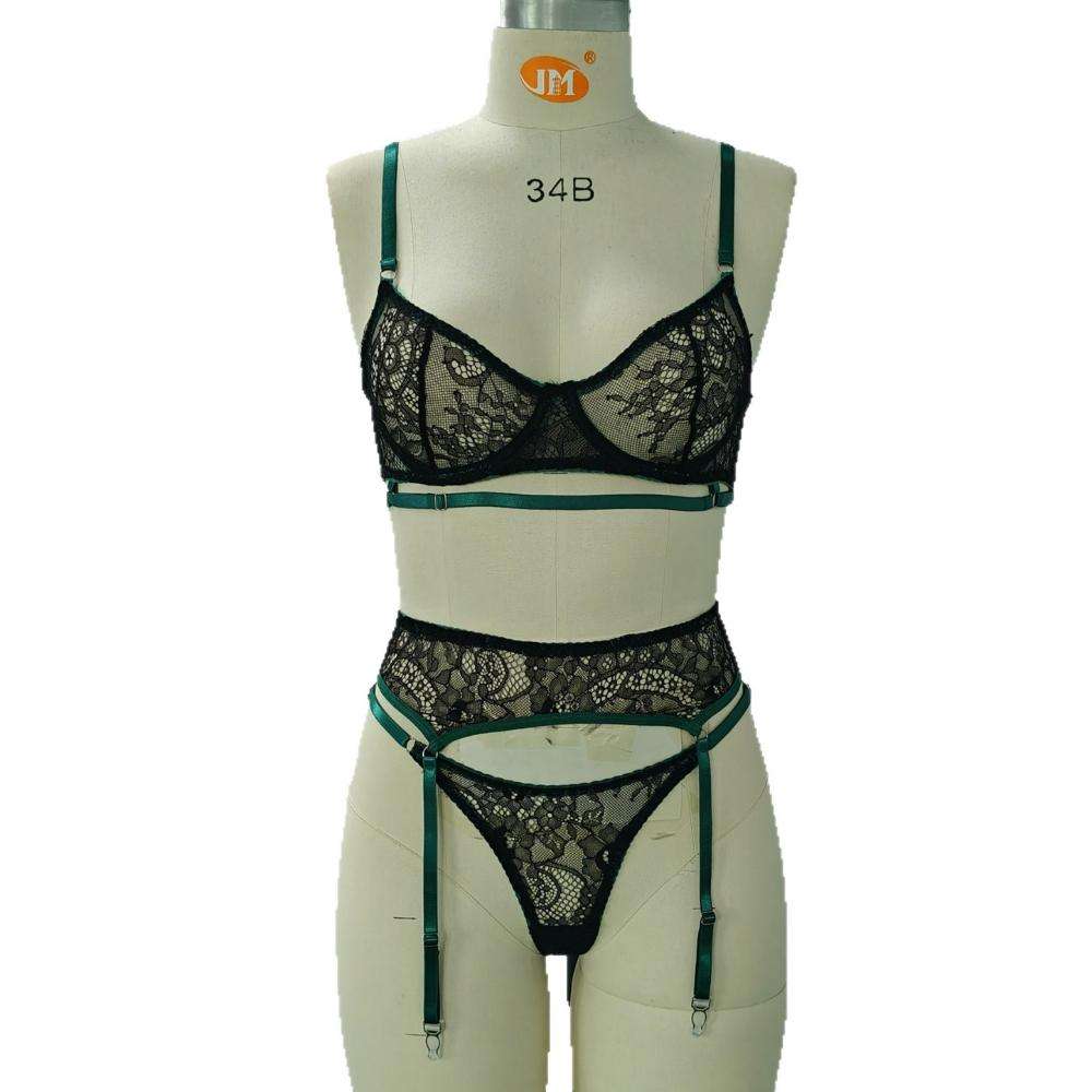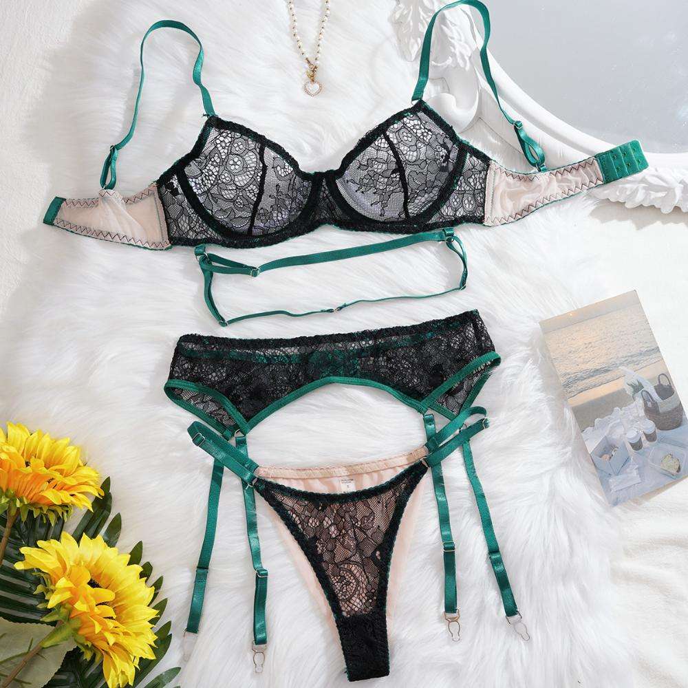 New European and American Women’s Clothing Green Lace Sexy Lace-up Patchwork See-through Slimming and Romantic Lingerie Set
