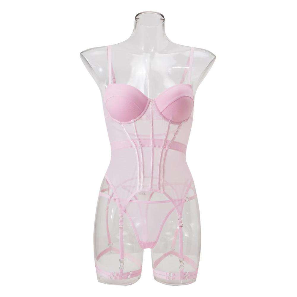 New Solid-color Strappy Mesh See-through Shaping and Sex Lingerie Set with Steel Ring Spliced Leg Rings Three-piece Set
