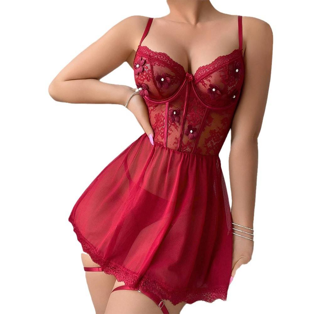 ODM One Size Floral Pattern Nightgown Thong Two-Piece Set Sexy Jersey Fabric Lace Perspective Teddies with Bow Hollow Ruffles