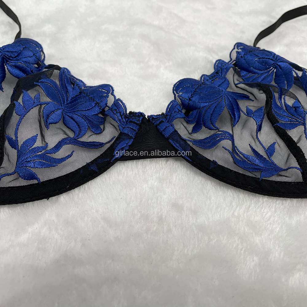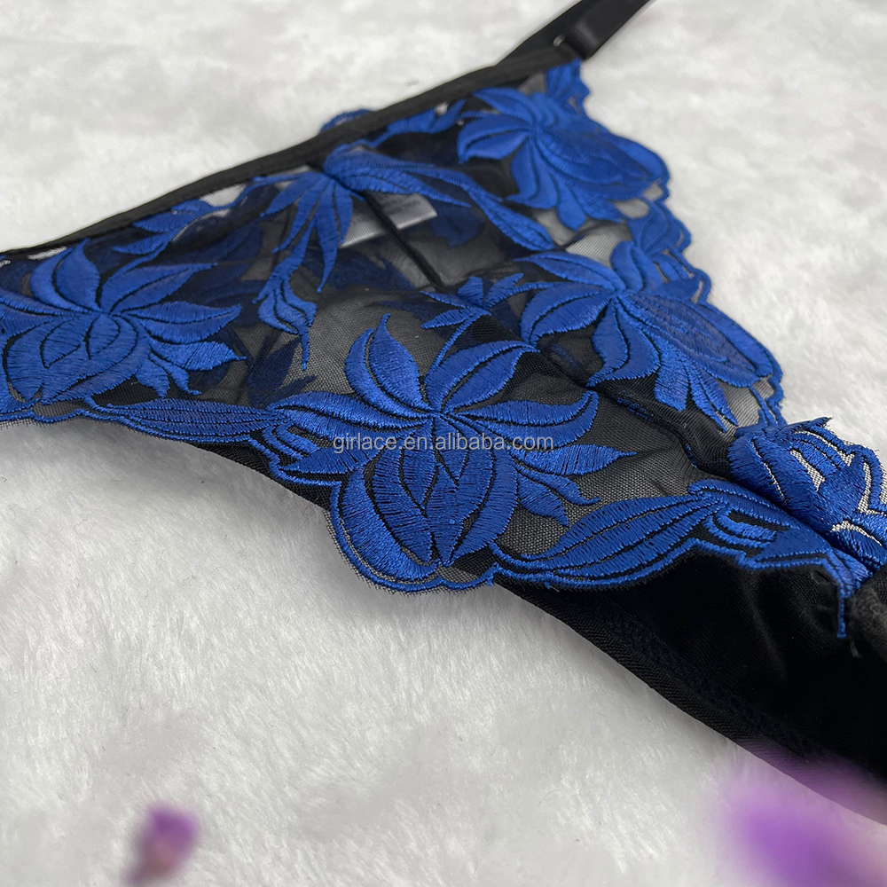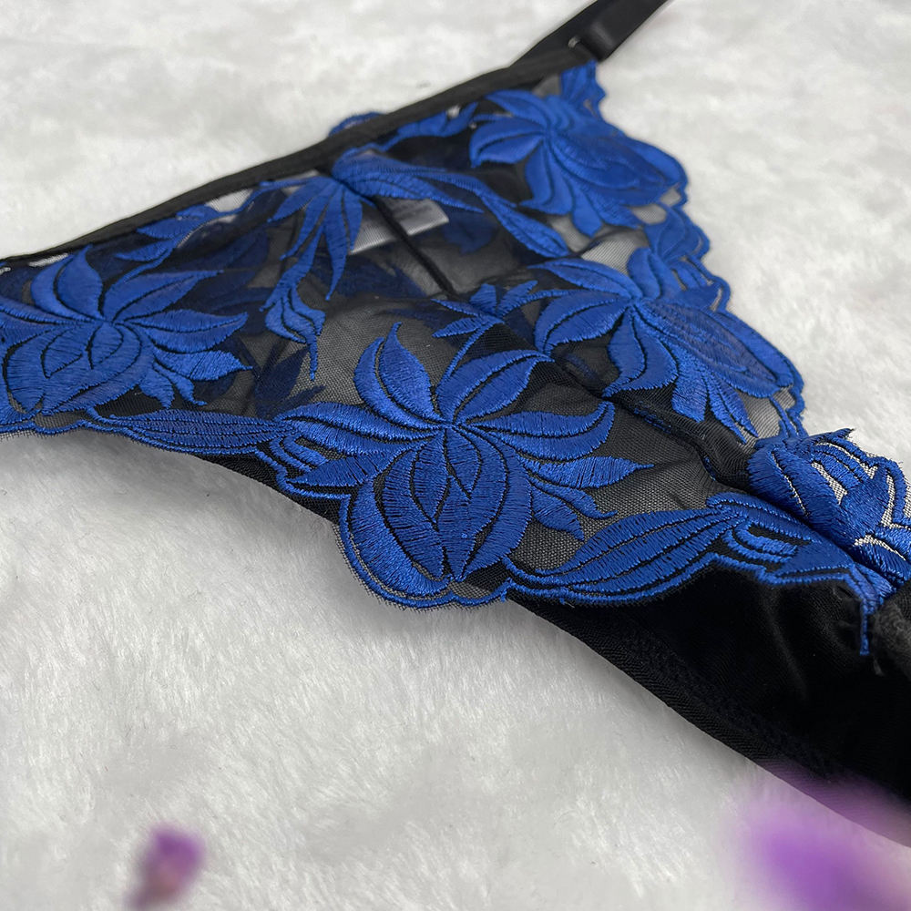 Pretty Blue Floral Embroidery Striking Black Mesh Bra and Thong Set Sexy Underwear with Light Lace Decoration
