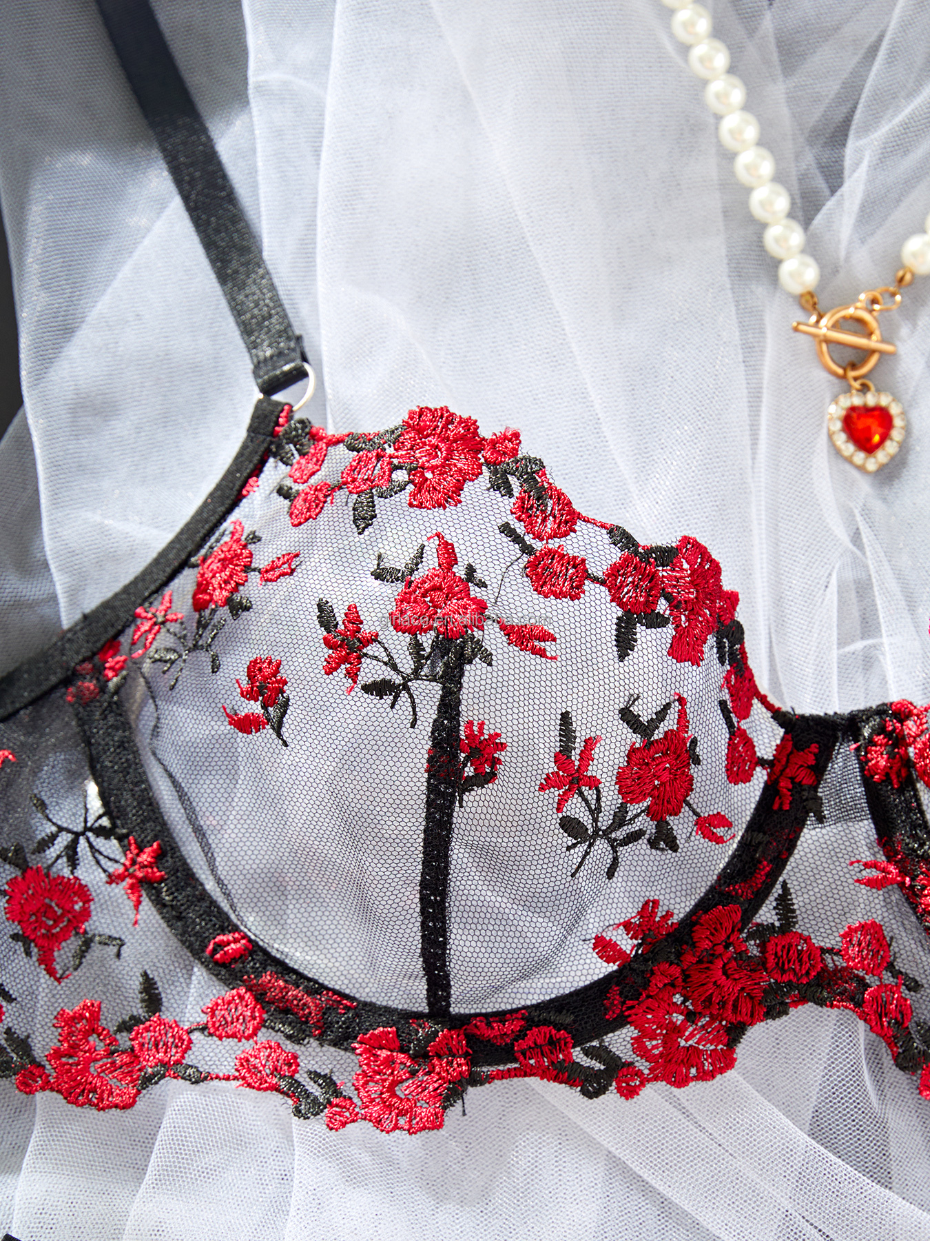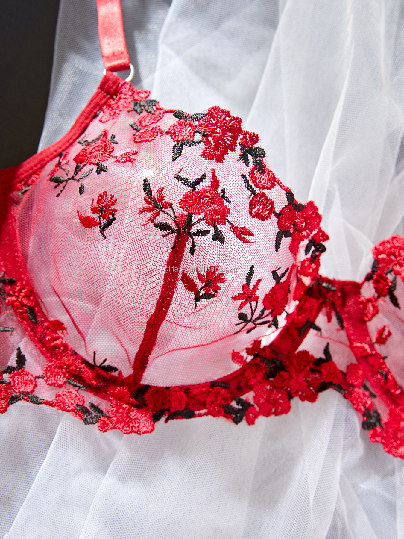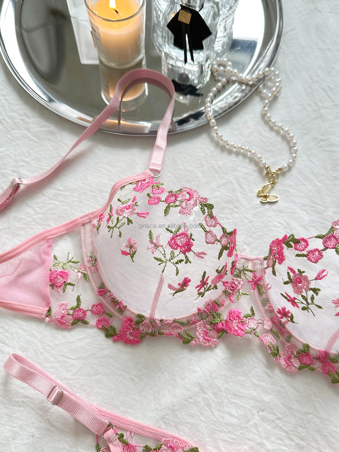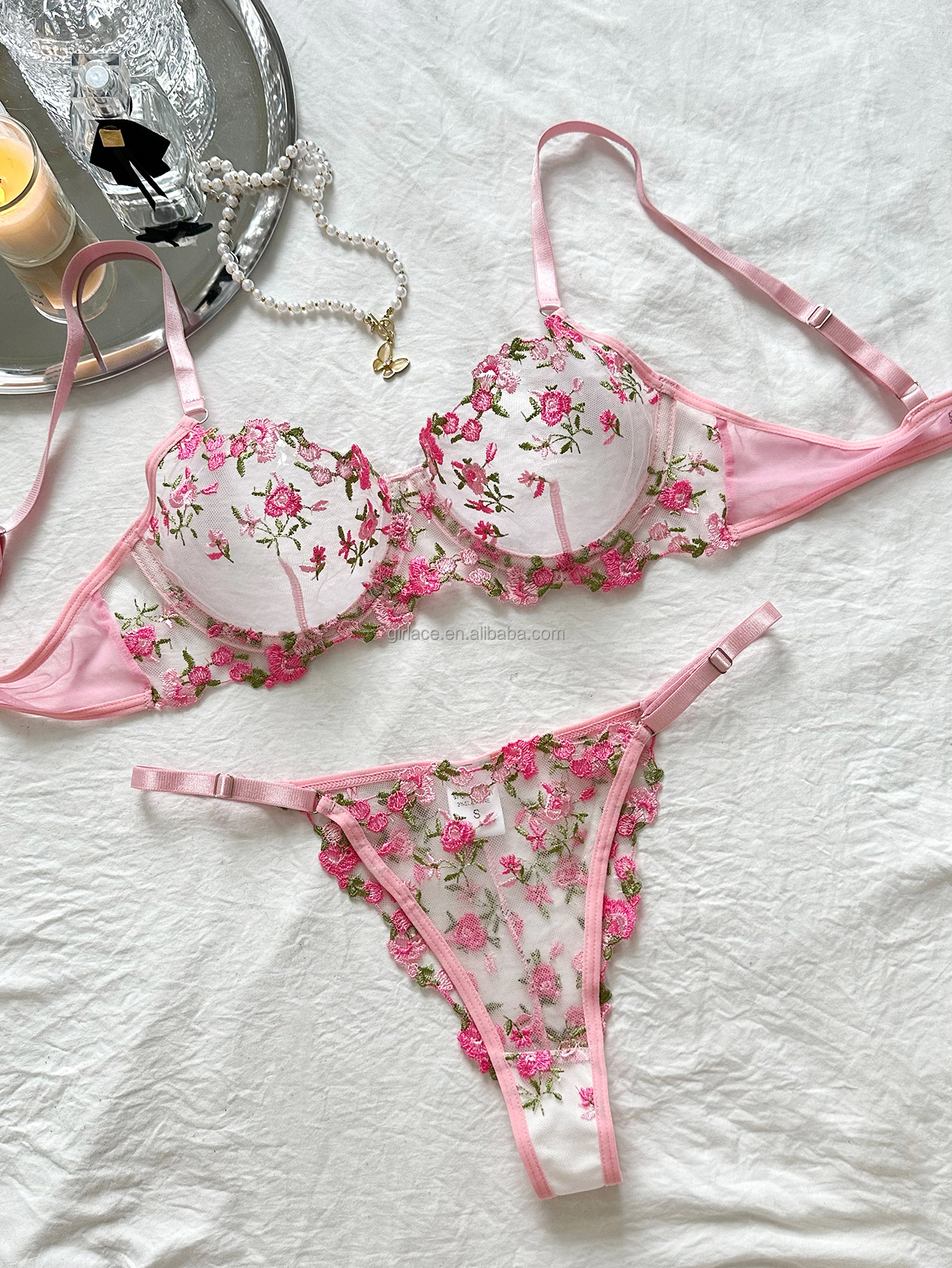 Romantic Pink Lace Bra and Thong Showcasing Vibrant Floral Details Floral Lace Babydoll Nightwear Erotic G-string Sleepwear Set