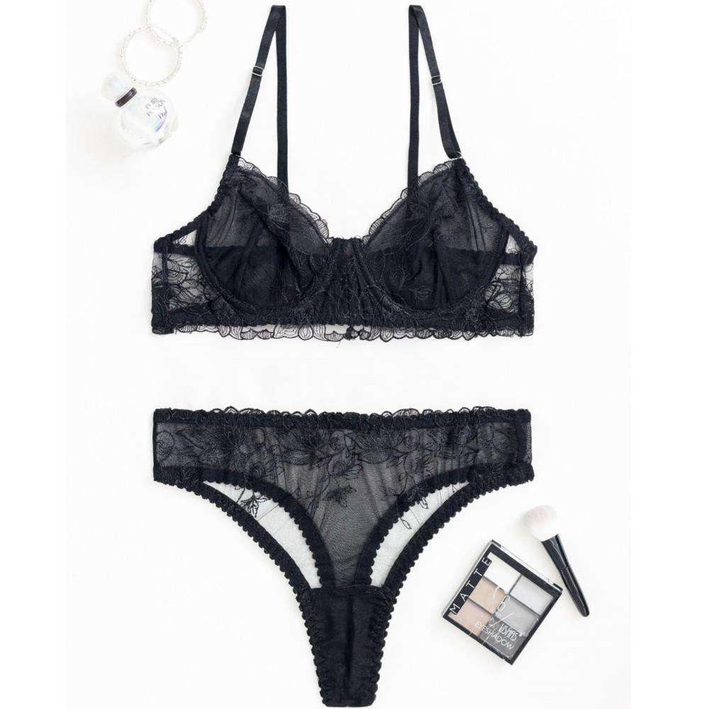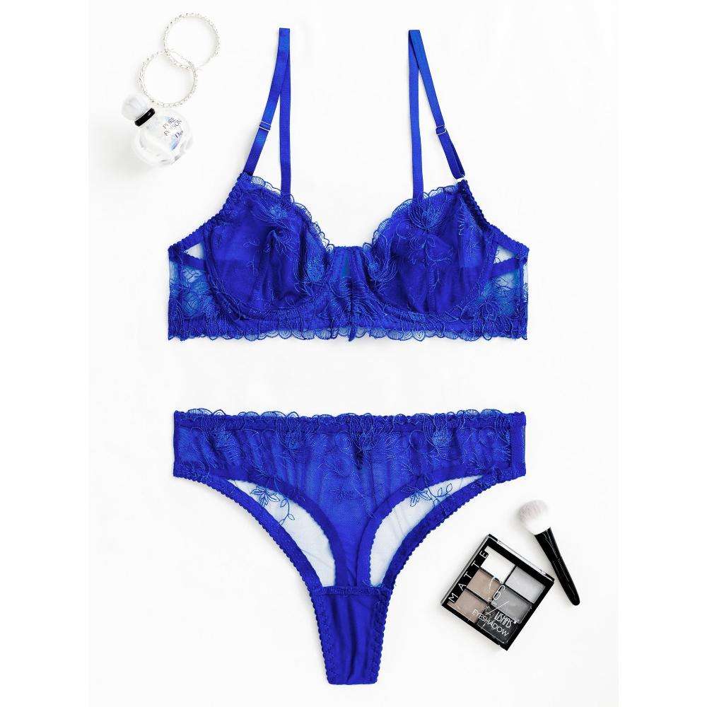 Sensual Lingerie, Womens Embroidered Lace, Lightweight, Breathable, Transparent Mesh Shoulder Strap Sexy Lace Underwear Bra Set