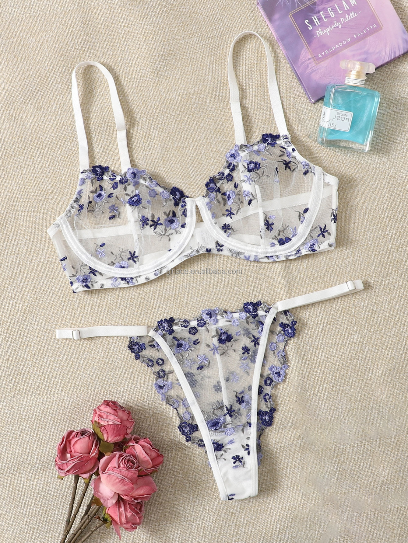 Valentine’s Day Gift 2 Piece Embroidery Flower Lingerie Set Transparent Underwear Women Sexy Bra and Thong Set