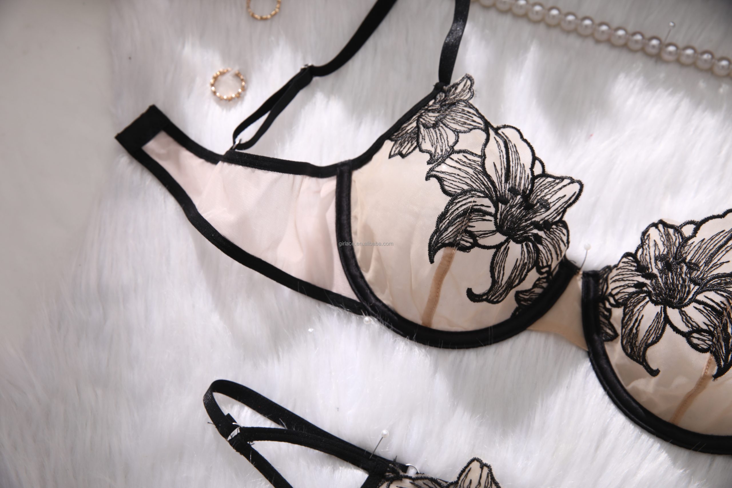 Wholesale Young Lady Fancy Push up Embroidered See Through Bra Top Sexy Bandage Erotica Bra Panty Set