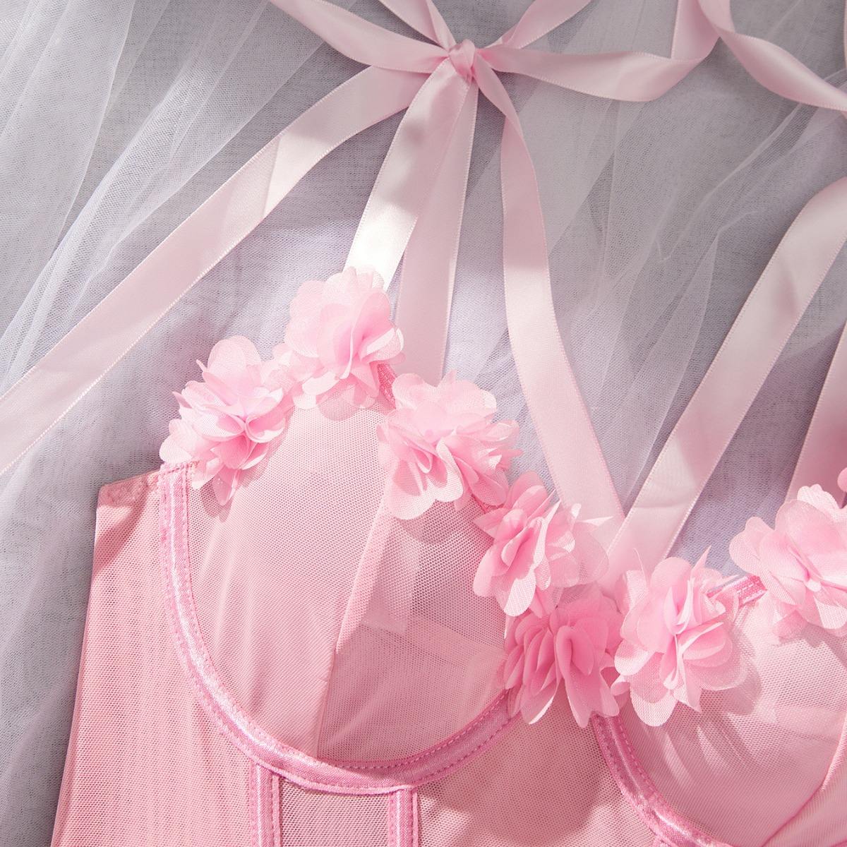 Women’s Convertible Pink Lace Bikini Set Sexy Three-Piece Erotic Lingerie with Logo Pattern Bra and Thongs