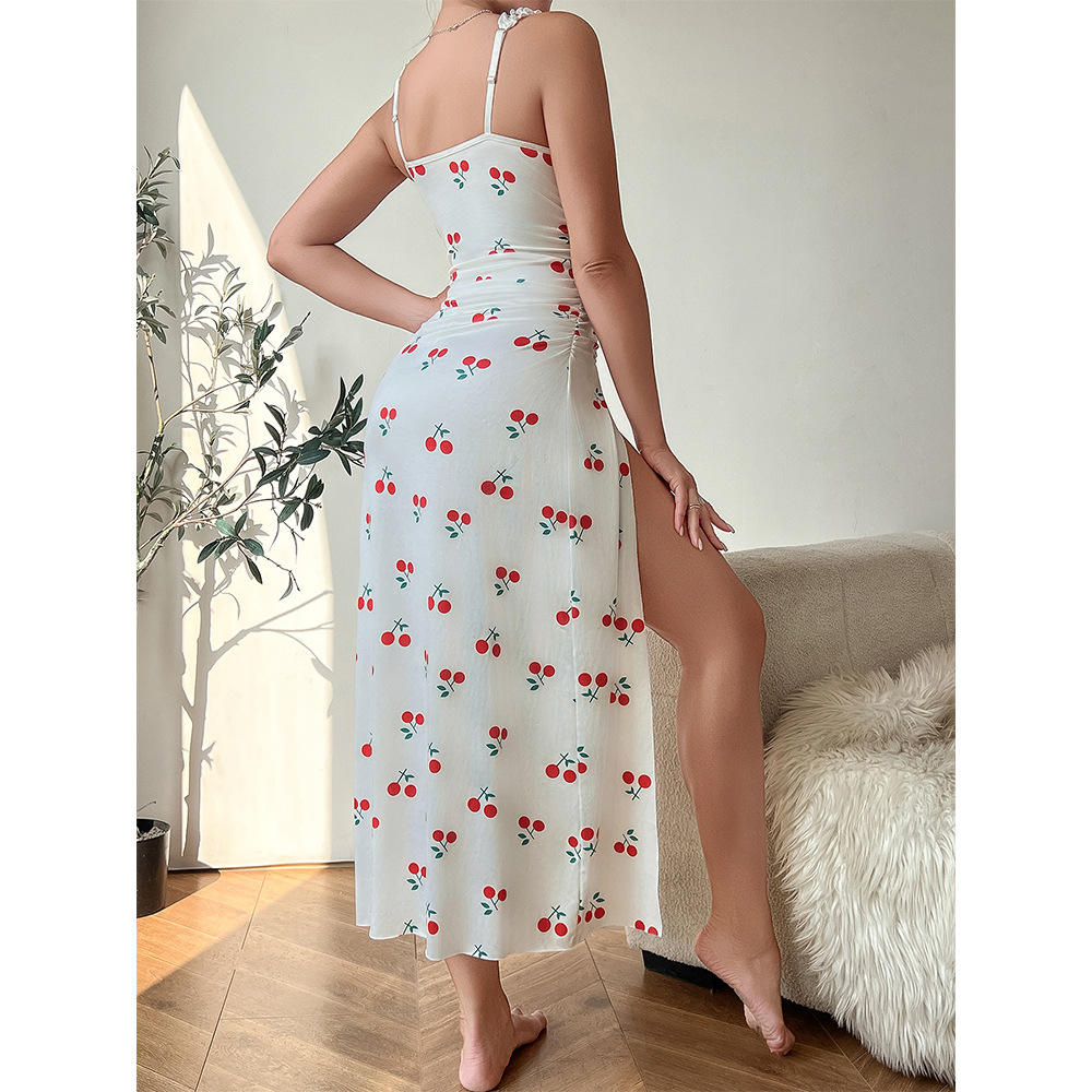 Women’s Sexy Cherry Print Strap Dress Long Sleepwear with Thong Set Bra & Briefs