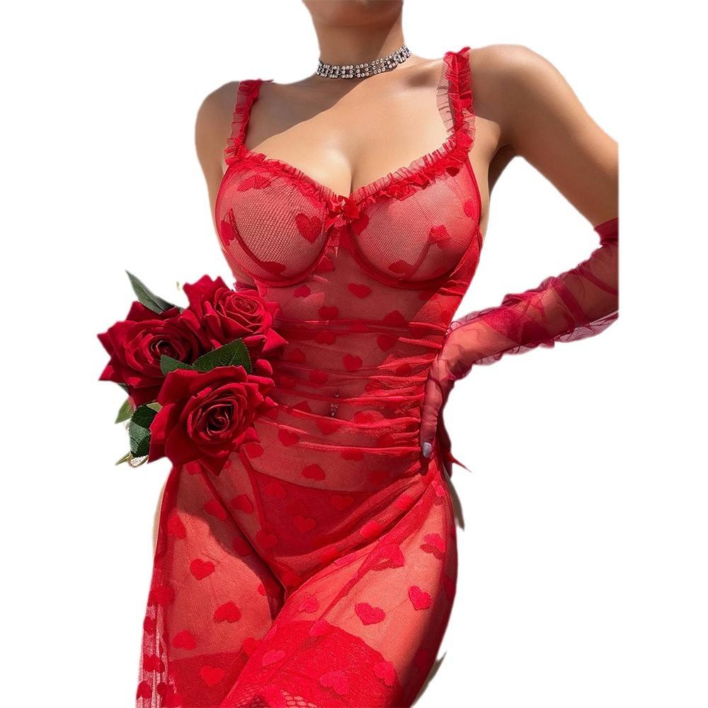 Women’s Sexy Lingerie Lace Sheer Long Dress Temptation Nightdress Thong Two-Piece Set New Style