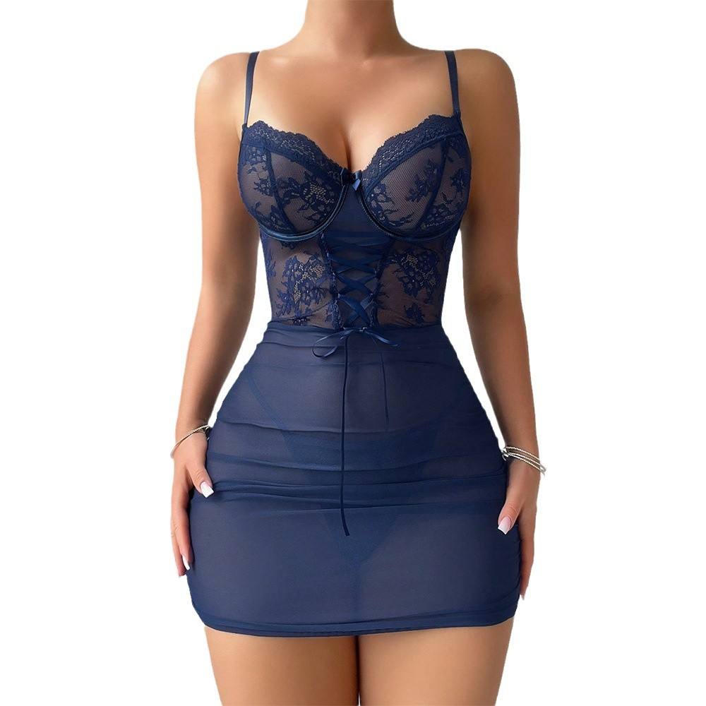 Women’s Sexy Lingerie Lace Sheer Temptation Nightdress Thong Two-Piece Set in Stock Hot New Arrival