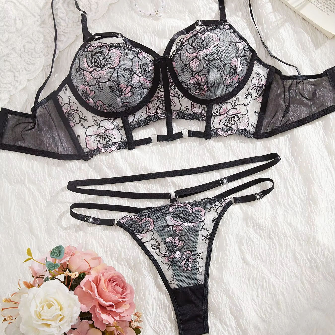 Women’s Sexy Lingerie Large Rose Design Black Collision Elegant Sexy Highlighting Waist Paired with Lace and Bow Decoration